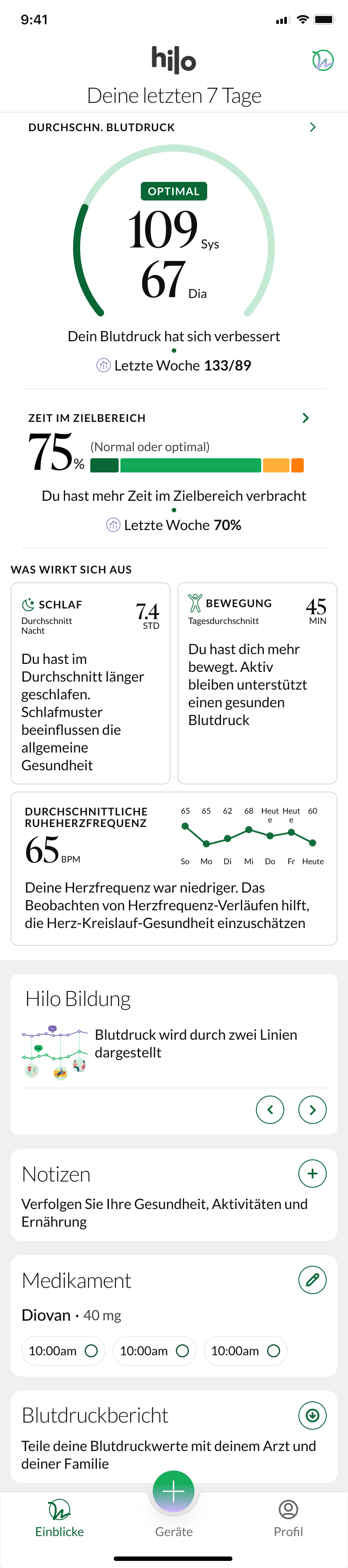 Knapp unter dem Durchschnitt, vergleichen Sie den Durchschnitt der letzten 7 Tage mit dem der Vorwoche (hier lag die letzte Woche bei 133 / 89). Das hilft Ihnen, Verbesserungen oder Veränderungen im Laufe der Zeit zu verfolgen.