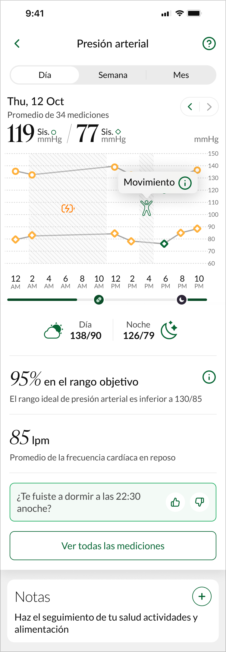 Los círculos representan la medición media de su tensión arterial sistólica en un intervalo de tiempo de 2 horas (se muestra en el eje inferior).