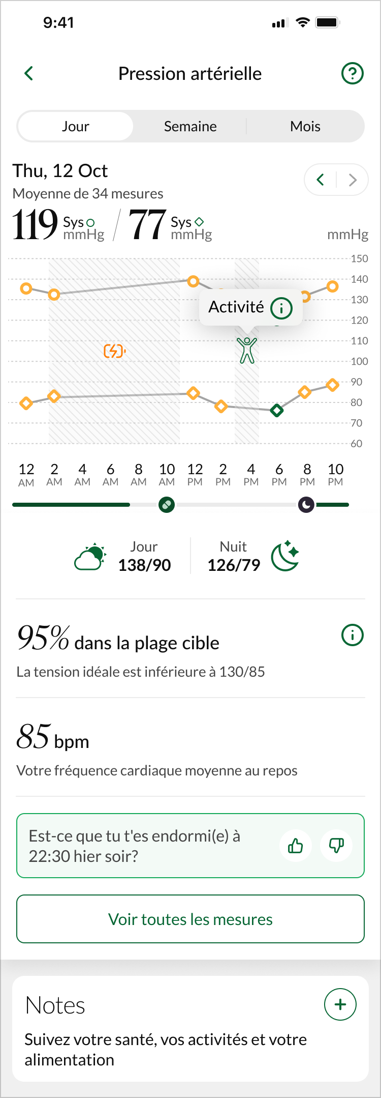 Veuillez cliquer sur l'icône en forme de point d'interrogation à côté de "Pression artérielle" pour voir les graphiques de classification de vos lectures.